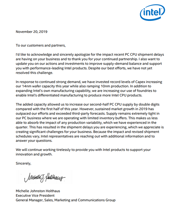 (内容要約: IntelではPC向けCPUの旺盛な需要に応えるべく、10nmプロセスのCPU生産の立ち上げと、14nmプロセスの生産能力を向上すべく「記録的な設備投資」を行い、更に外部のファウンドリーの活用も増やして供給能力の改善を図ってきた。これらによって2019年後半(7~12月)にはCPUの供給量が上半期(1~6月)対比で「2ケタ増」となった。しかしながら、2019年のPC市場の需要がIntelの努力やサードパーティーの予想を大きく上回り、結果として引き続きCPUの供給不足の状況が続いている。引き続き生産能力向上に努力を続けるが供給能力が足りない状況はまだ続くと思われる—–あとは謝罪と感謝と忍耐のお願い。By 副社長ミッシェル・ジョンストン・ホルトハウス)