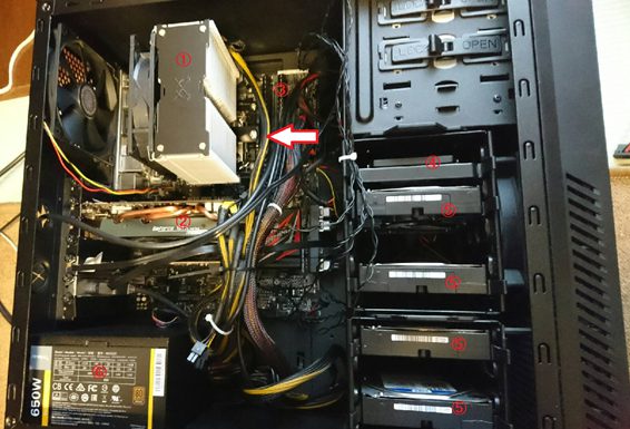 そしてその他のパソコンを形作る重要なパーツについて写真の中に番号をつけてみた。CPUの上にそびえ立つのは①冷却用のファンとラジエター、その下に銅色のパイプが見えるパーツが②エヌビディアのGPU(GeForce GTX)、矢印の上に縦に2枚あるのが③メモリー・モジュール、右側にある④がWestern DigitalのSATA接続のSSD、⑤が同じくWestern Digitalの容量3TBのHDDが4機である。当然、CPUが乗っているATX規格のマザーボード(縦244㎜、横305㎜)上には、無数のMLCC(積層セラミックコンデンサ)やタンタル・コンデンサー、或いは通信用のモジュールやネットワーク用半導体などなどが搭載されている。