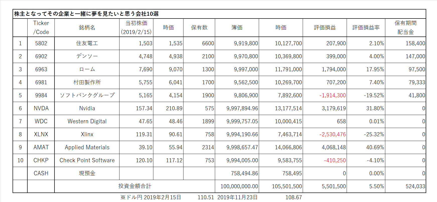 *上記表について:日本株、米国株からそれぞれ上限を5銘柄として絞り込み、ひと銘柄当たりの投資余力を10百万円として、株数を計算。売買手数料は証券会社によって違うので考慮していない。ビジネス・トレンドや各企業の状況により適宜入れ替える。ロスカット、益出しルール等の設定はしない。