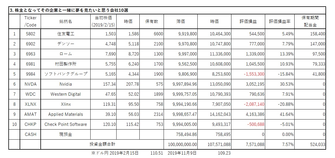 *上記表について:日本株、米国株からそれぞれ上限を5銘柄として絞り込み、ひと銘柄当たりの投資余力を10百万円として、株数を計算。売買手数料は証券会社によって違うので考慮していない。ビジネス・トレンドや各企業の状況により適宜入れ替える。ロスカット、益出しルール等の設定はしない。