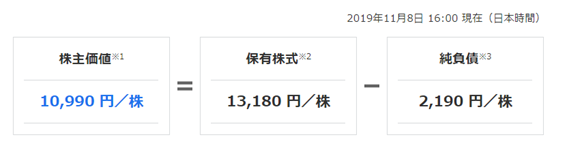 きっとこの先、膨らんでいる時価評価の部分の売却が始まり、評価益が実現利益として計上され、打ち出の小槌のように会計上の利益が出て来る時が来るだろう。その時やっと市場は気がつく筈だ。どこにその打ち出の小槌があるのかを。ソフトバンク・グループの分析を会計上の利益ですることの無意味さに。きっとその頃の決算説明会のプレゼンテーションで孫会長は「私は一貫して株主価値を唯一最大の物差しとして経営して来ました」と、歌舞伎役者の如くに大見得を切るだろう。この四半期もソフトバンク・グループは一兆円以上の時価総額を膨らました。11月8日現在の同社の株価は4,344円だが、「基準価額」は下記の通りだ。これをどう捉えるかは、その投資家の投資スタンスでしかない。