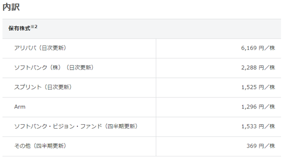 この13,180円の内訳は下記の通り。Weworkや「犬の散歩」の会社の時価はビジョンファンドとその他の中に埋もれている。