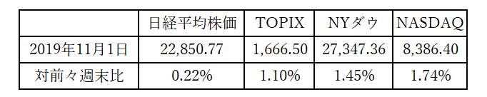 日米各株式市場の先週の終値と週間騰落率