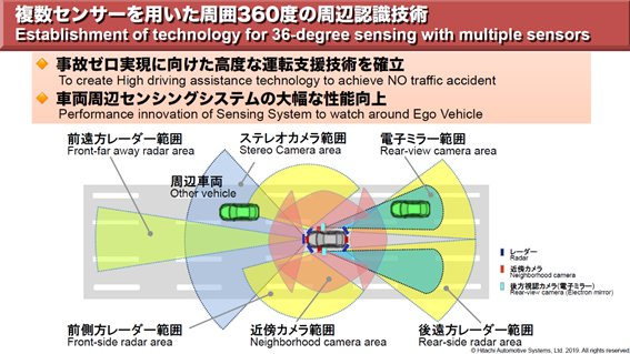 後者についてはあまり驚きが無い(それでもビックリしたのは事実)のだが、前者については驚きもあり、また多くのインプリケーションがある。下の図は、東京モーターショーで日立オートモティブシステムズが掲示していたクルマの360度センサーの概要説明だが、こうした製品を作っている大手サプライヤーが同社である。だが、日立製作所100%出資の株式会社であるため投資先とはならなかった。強いて言えば、日立製作所(6501)への投資が代替的にこの企業のエクスポージャーを取る形になるのだが、その時は一緒に日立製作所の他の事業部門まで投資をすることになる。日立製作所の原子力部門や家電部門に投資をしたいとは普通は思わないだろう。今回の経営統合後の姿が上場企業なのか、非上場企業となってしまうのかは未定だが、もし単独上場となれば面白い投資先となり得るだろう。非常に楽しみだ。