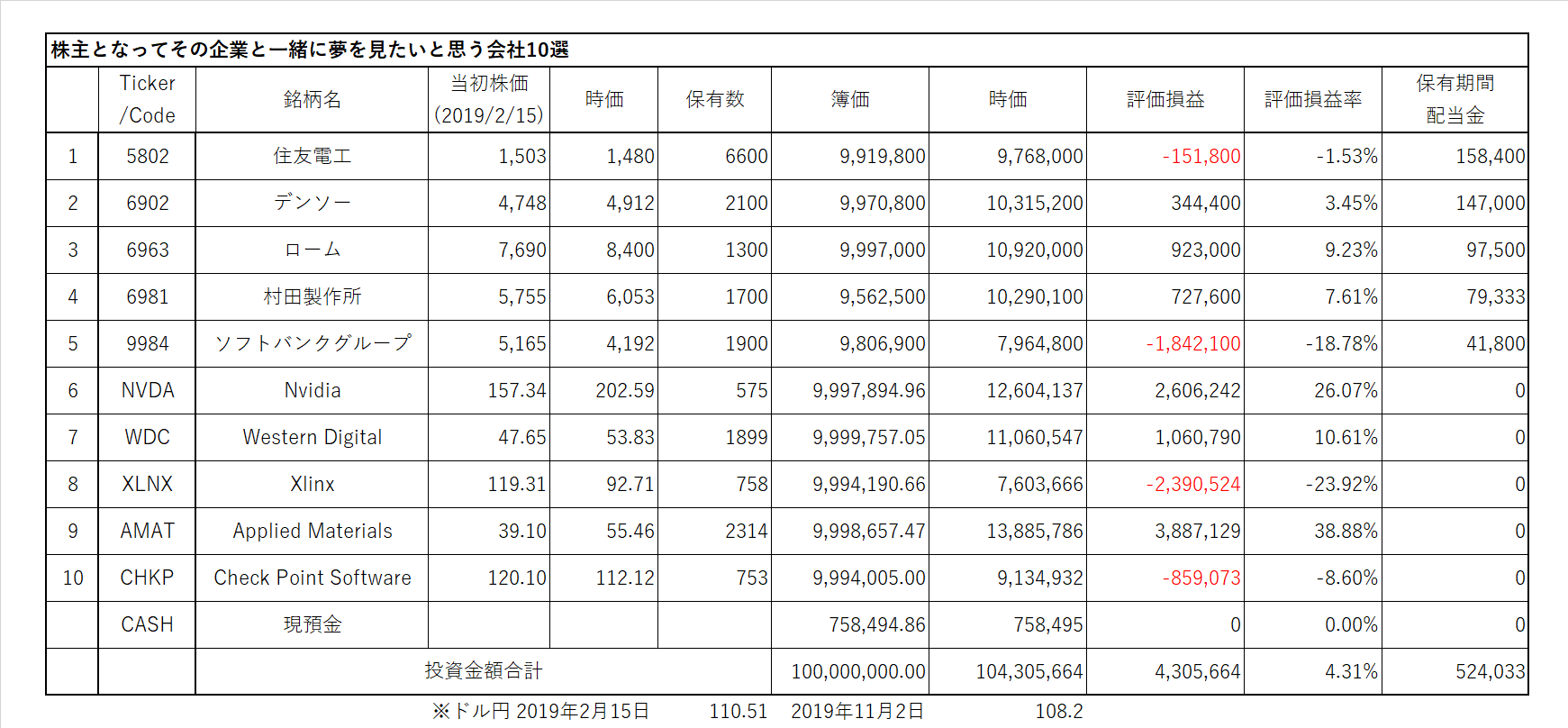 *上記表について:日本株、米国株からそれぞれ上限を5銘柄として絞り込み、ひと銘柄当たりの投資余力を10百万円として、株数を計算。売買手数料は証券会社によって違うので考慮していない。ビジネス・トレンドや各企業の状況により適宜入れ替える。ロスカット、益出しルール等の設定はしない。