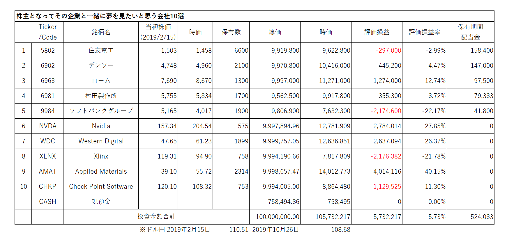 *上記表について:日本株、米国株からそれぞれ上限を5銘柄として絞り込み、ひと銘柄当たりの投資余力を10百万円として、株数を計算。売買手数料は証券会社によって違うので考慮していない。ビジネス・トレンドや各企業の状況により適宜入れ替える。ロスカット、益出しルール等の設定はしない。
