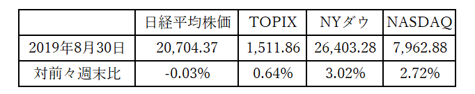 日米各株式市場の先週の終値と週間騰落率