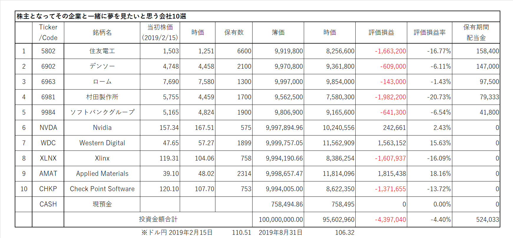 *上記表について:日本株、米国株からそれぞれ上限を5銘柄として絞り込み、ひと銘柄当たりの投資余力を10百万円として、株数を計算。売買手数料は証券会社によって違うので考慮していない。ビジネス・トレンドや各企業の状況により適宜入れ替える。ロスカット、益出しルール等の設定はしない。
