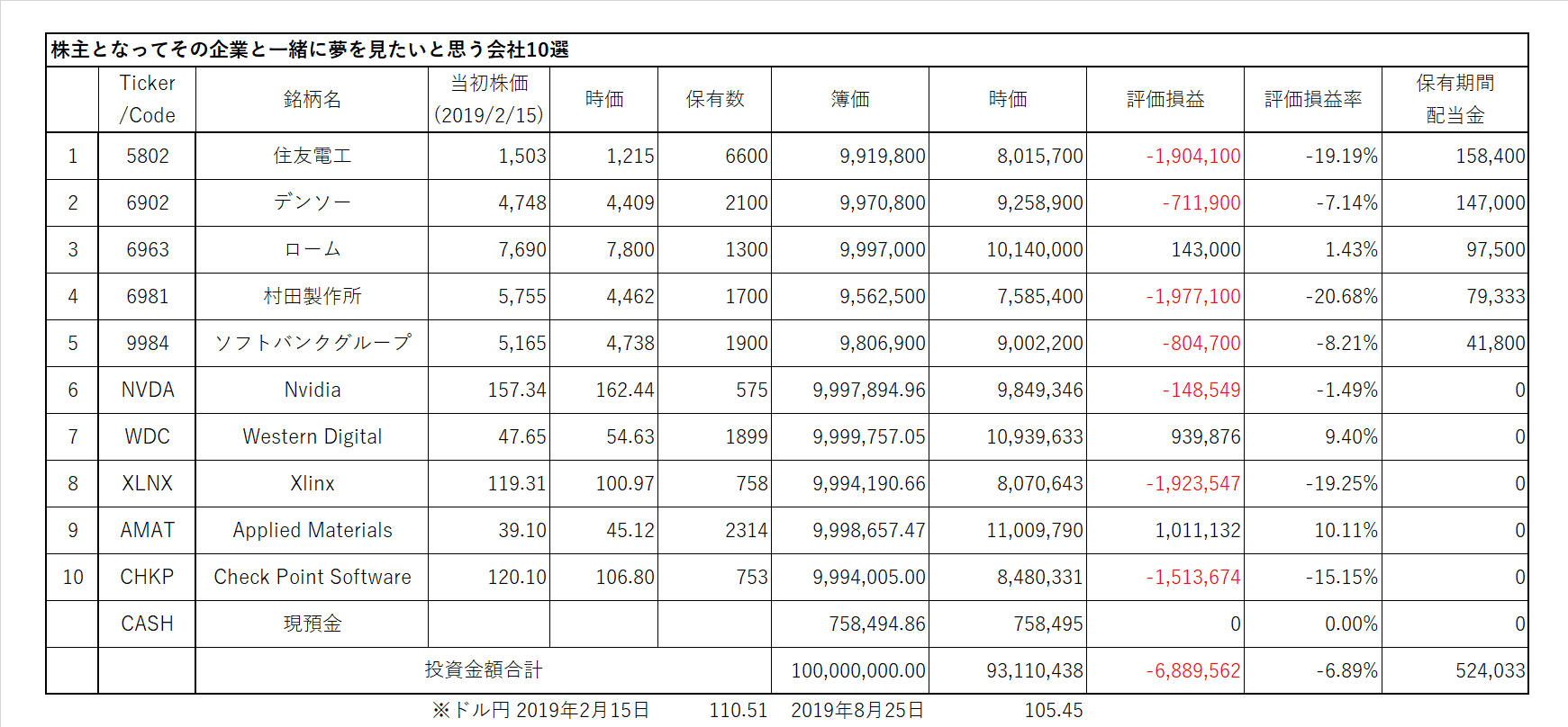 *上記表について:日本株、米国株からそれぞれ上限を5銘柄として絞り込み、ひと銘柄当たりの投資余力を10百万円として、株数を計算。売買手数料は証券会社によって違うので考慮していない。ビジネス・トレンドや各企業の状況により適宜入れ替える。ロスカット、益出しルール等の設定はしない。