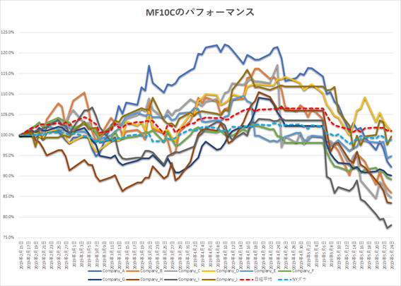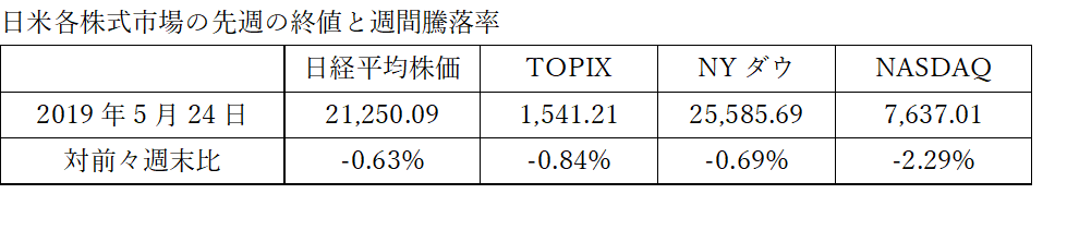 先週(5/20~5/24)の日米各株式市場の騰落率は下記の表の通り。今週も米中貿易摩擦問題に端を発したHuawei(ファーウェイ)問題があり、更にはクアルコムが再度司法の泥沼に落ちる羽目(後述)にもなり、NASDAQの下げがきつい。これらはどれも結局「注目するビジネス・トレンド」にもろに影響する話なので、今週もMF10Cのパフォーマンスは厳しい。