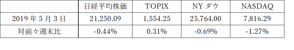 週を通じて先週も話題の中心は「米中貿易摩擦問題」であり、双方の舌戦が相場に大きく影響した。ただ新時代「令和」になって、初めて日本の株価上昇が水曜日と金曜日に観測出来てホッとしたことと、いつもの通り、日米株式市場で同じこのテーマについての反応がズレ始めたことをお伝えしておく。
