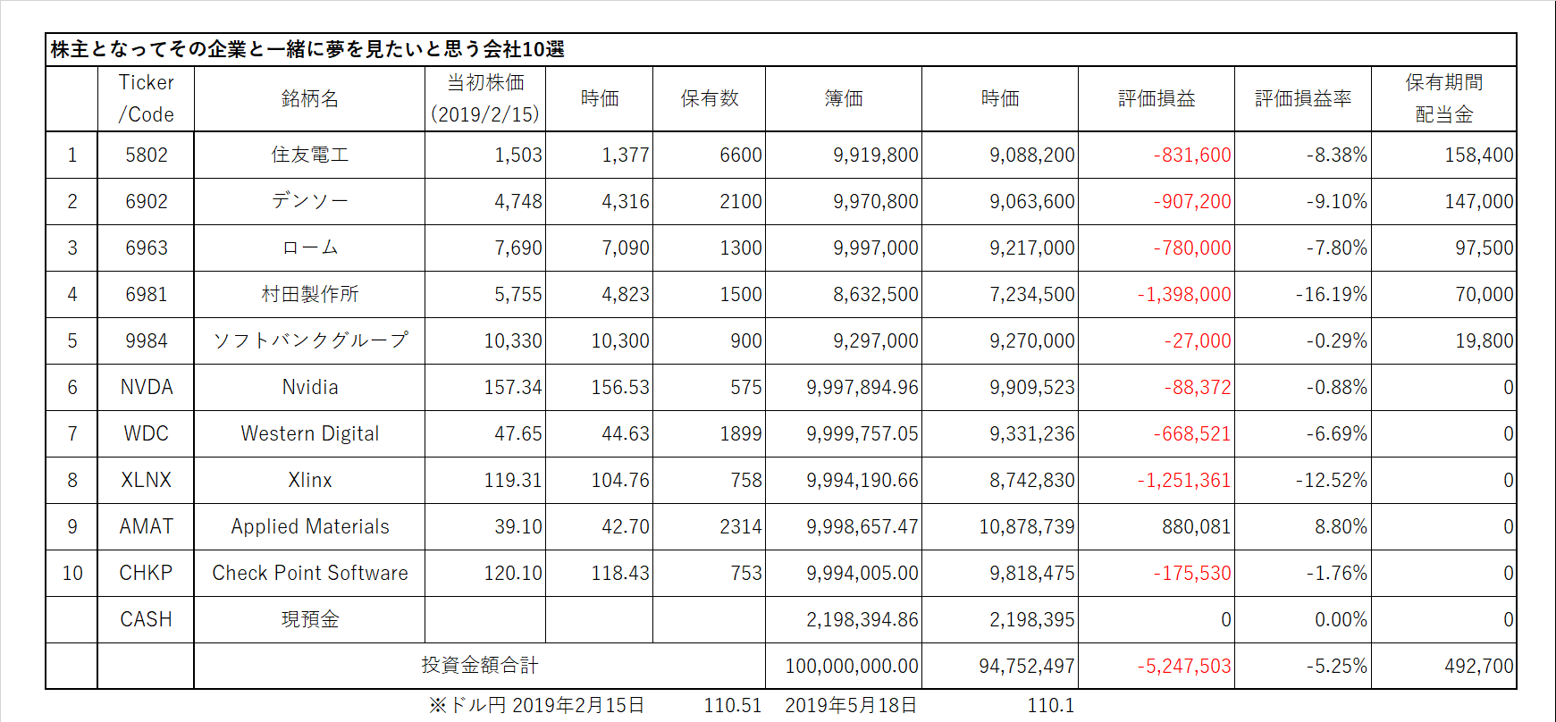 *上記表について:日本株、米国株からそれぞれ上限を5銘柄として絞り込み、ひと銘柄当たりの投資余力を10百万円として、株数を計算。売買手数料は証券会社によって違うので考慮していない。ビジネス・トレンドや各企業の状況により適宜入れ替える。ロスカット、益出しルール等の設定はしない。