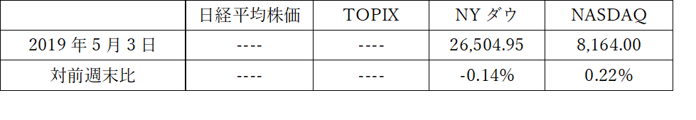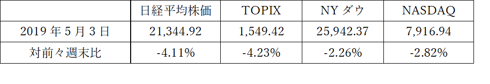 そして下の表が10連休を終えて、最終日にトランプ大統領のツイートに肝を冷やしつつ迎えて過ごしたこの一週間の株式市場の動きである。と言っても、日本市場の起点をGW前の4月26日としたので、米国市場も下の表では基準を合わせてある。