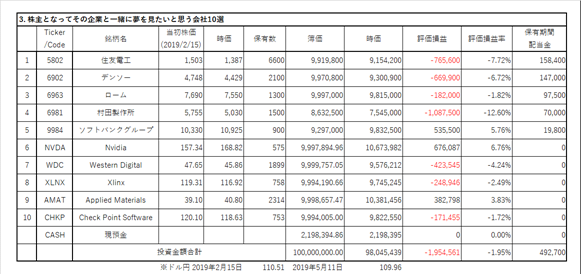 *上記表について:日本株、米国株からそれぞれ上限を5銘柄として絞り込み、ひと銘柄当たりの投資余力を10百万円として、株数を計算。売買手数料は証券会社によって違うので考慮していない。ビジネストレンドや各企業の状況により適宜入れ替える。ロスカット、益出しルール等の設定はしない。