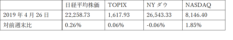 平成最後の一週間となった先週(4/22~4/26)は、10連休のGW前ということもあり、日本市場は様子見気分が強かった一方、CY2019Q1の決算が本格化しはじめた米国市場、及び2019年3月期決算発表が始まった日本共に、週後半に向かって決算内容を受けて一波乱あった一週間となった。