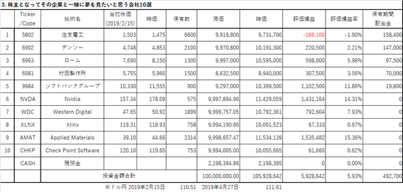 *上記表について:日本株、米国株からそれぞれ上限を5銘柄として絞り込み、ひと銘柄当たりの投資余力を10百万円として、株数を計算。売買手数料は証券会社によって違うので考慮していない。ビジネストレンドや各企業の状況により適宜入れ替える。ロスカット、益出しルール等の設定はしない。
