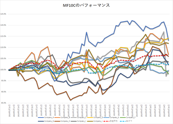 まずはMF10Cのパフォーマンスチャートを下記にご紹介する。全体に今週はラインがうな垂れている。一番ひどいのはグレーのラインで示されたCompany_Cことザイリンクスである。一日で117.1%水準から97.1%まで急落した。Company_Aことエヌビディアも、一旦23日に121%台を回復したが、半導体関連銘柄の下押しに付き合って週末は113.2%である。何とも胃が痛い一週間であった。以下、個別に見ていくことにする。