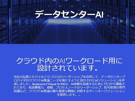 さて、話は本題に戻ってデータセンタ向けのCPUの話です。実はクアルコムが発表した「Cloud AI 100」というのは、CPUというのともちょっと違います。データセンタのサーバーなどを想定したAI処理向け専用のプロセッサーということになります。アクセラレーターと呼ばれる場合もありますが、AI推論処理の高速化を目的に開発された特別な半導体ということです。
