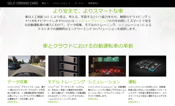 試しにエヌビディア(NVDA)のサイトを開いてみる。このURL(https://www.nvidia.com/ja-jp/self-driving-cars/)で開いたページはこんな感じ。