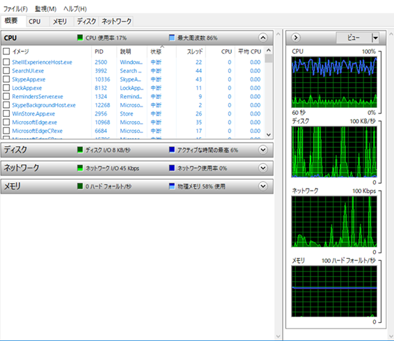 パソコンでタスクマネージャーを開く(Ctrl+Altを押しながらDeleteキー)と、リソースモニターのというプログラムがWindowsならば必ずついている。原稿を書きながらWebを開いたりしている程度の現在の私のPCのそれを添付する。