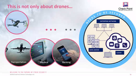 まずはWorld Economic Forumで取り上げられた2018年のGlobal Riskについて話があります。2018年にはCyber Attackは第3位に上昇しています。プレゼンテーションの最初の掴みは、CEOと息子さんがドローンで遊んでいる話から入るのですが、ポイントはここからです。
