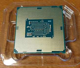 これはCPUの裏側で、周りの金色のドットが所謂LGA(Land Grid Array)と呼ばれる接点部分で、その真ん中に四角い小さなゴマのように見える粒々が積層セラミックコンデンサである。0.6ミリ×0.3ミリ程度のものから、より小さいものまでいろいろあるが、これが無いと殆どの電子機器は役に立たない。