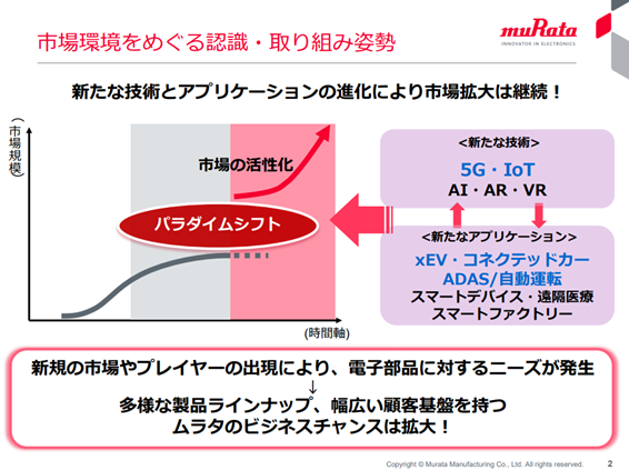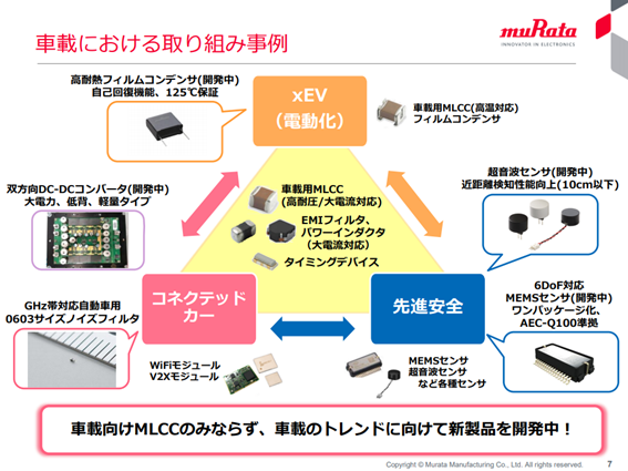 そこで2018年11月29日に行われた会社説明会のプレゼンテーション資料を開けてみると、最初から注目のビジネストレンドの話になり、はじめのうちは車載関係の話で埋まる。まずはFGの考え方と、村田製作所の考え方が同じであることが確認出来るのがこれ。
