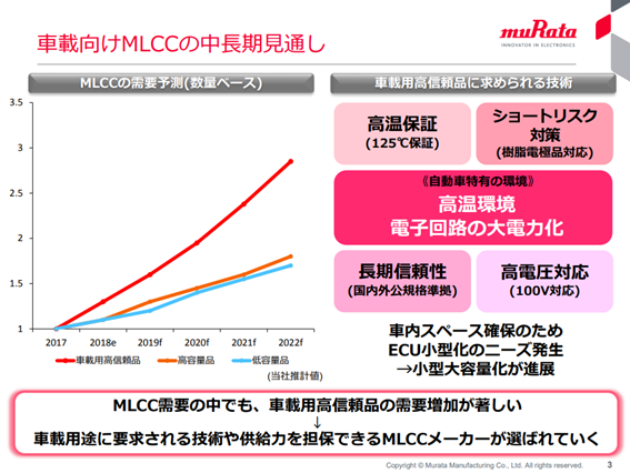 MLCCとはMulti-Layer Ceramic Capacitorの略で、Capacitor(キャパシター)とはコンデンサのことである。ご覧いただける通り、需要予測は株式関係者が大好きな右肩上がりのチャートになっている。そして何が車載用途だと求めらるのかが明らかにされている。