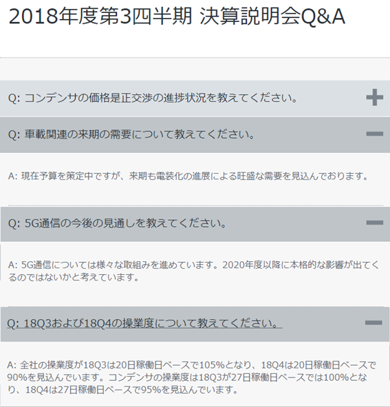 その問題のQ&A、ご覧頂けるように、車載関連も5G通信関連の先々についても、正に機関投資家や証券アナリスト達が注目しているから質問が飛んでいるのであり、それに対して期待が持てるという内容の答えを返している。