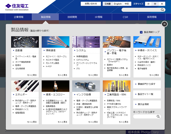 トップページ自体は地味なのだが、製品情報を開いてみると、何やら欲しいキーワードに関する答えがずらりと並んでいる。つまり、自動車部品のみならず、光ファイバーなどの情報通信、関連する半導体やデバイスである。
