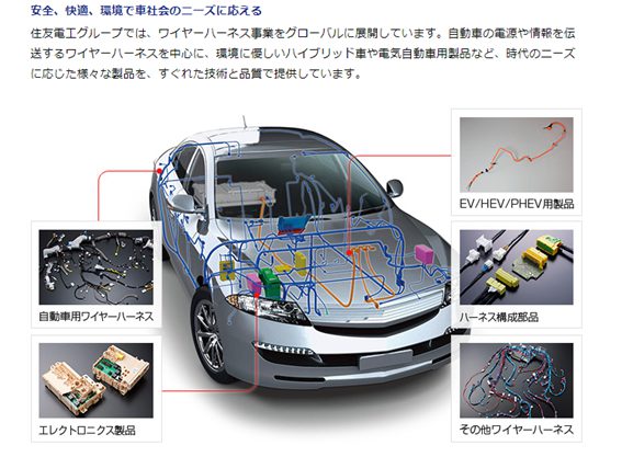 まずは自動車部門でワイヤーハーネスというページに飛んでつらつらとスクロールダウンしていくと、ワイヤーハーネスなどについて「さらに詳しく!」との表示で住友電装へのリンクがある。ここへ飛んでみると「正にこれだよね」という内容だ。