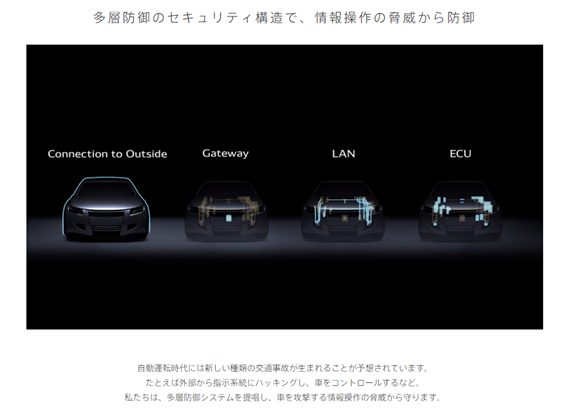 ただ自動運転化が進む過程で上述のようなV2Xも進めば、車の中の制御システムのECU、具体的にはステアリング操作やブレーキ操作などを司る演算装置に繋がっているネットワークがハッキングされるリスクに晒されることになる。だからこそ車のセキュリティーという概念が、現在の「コンシェルジュ・サービス」のような次元とは異なるレベルで重要になって来る。そうしたことが非常に分り易く、またカッコ良く(個人的にはこれは重要な要素)説明されている。