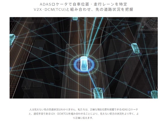 更に個別に、例えば自動運転の項にある「5つのキーファンクション」という中から「先を読む」というところを選んで貰えば、正にそこに「路車間通信」や「車車間通信」のことである「V2X」の話がある。「V2X」とは、「Vehicle to Infrastructure」であったり「Vehicle to Vehicle」であったり、要するに車と何かを繋げることの意味(Xは数学の方程式でも使うXのこと)で、これが見えないところの先読みを可能にする重要な技術であることの裏を取ることが出来る。これはすなわち自動車業界が既に取り組んでいるという証でもある。