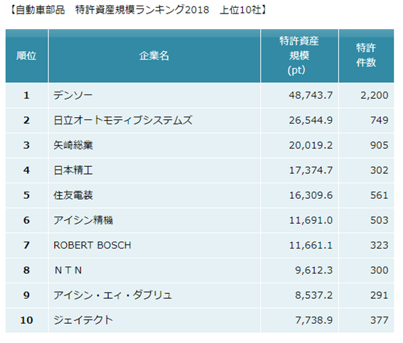 実はネット上を調べ回っている内に、面白いデータを見つけた。それが「自動車部品の特許資産規模ランキング」というデータだ。それが下記の図。