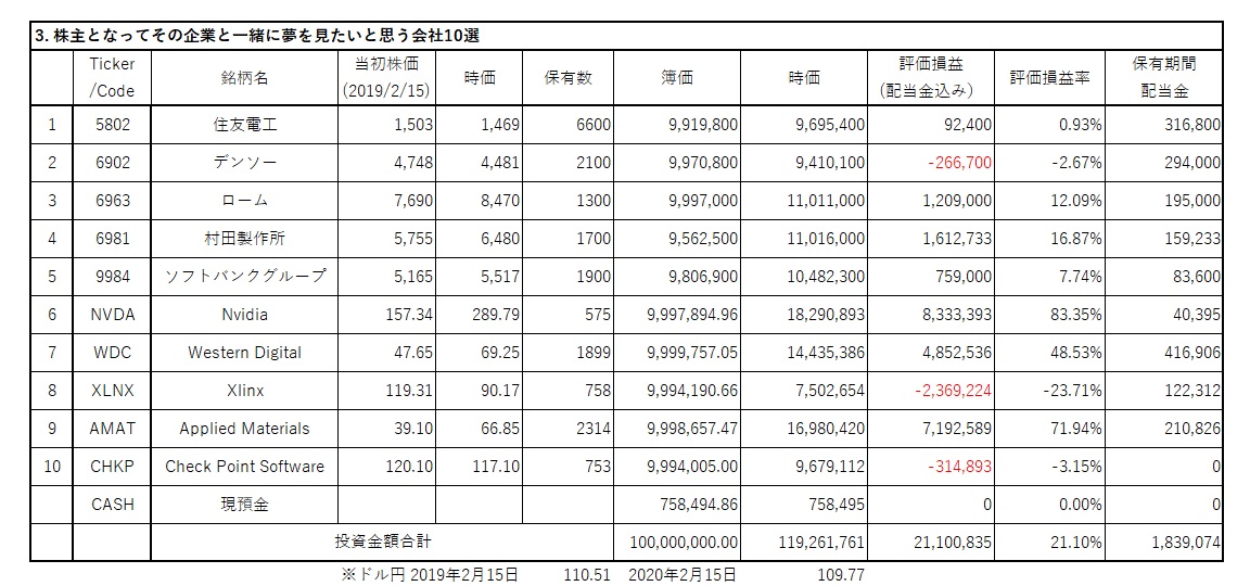 *上記表について:日本株、米国株からそれぞれ上限を5銘柄として絞り込み、ひと銘柄当たりの投資余力を10百万円として、株数を計算。売買手数料は証券会社によって違うので考慮していない。ビジネス・トレンドや各企業の状況により適宜入れ替える。ロスカット、益出しルール等の設定はしない。