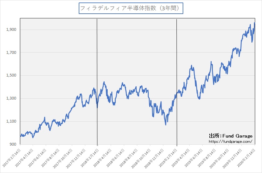 まずは下のチャートをご覧頂こう。Premium会員の皆様にはお馴染みのフィラデルフィア半導体指数の過去3年間の推移だ。一年毎に縦線も強調してみた。
