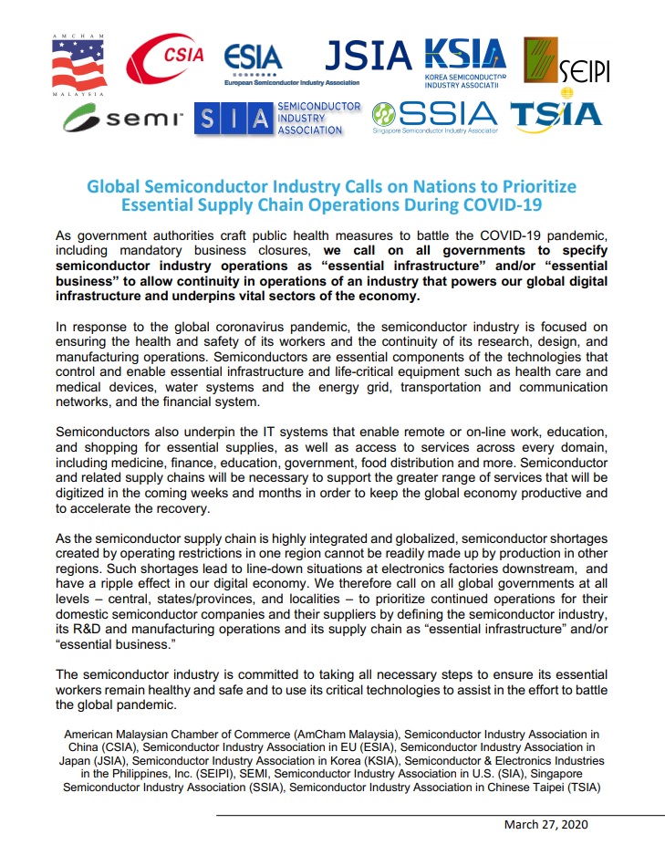まずは下のレターを見て頂きたい。これは各国のSIAが連名で発表した国への要望文だ。具体的には中国、台湾、EU、日本、韓国、米国、シンガポールのSIA、およびマレーシアとフィリピンの半導体および電子産業を代表する業界団体が参加している。