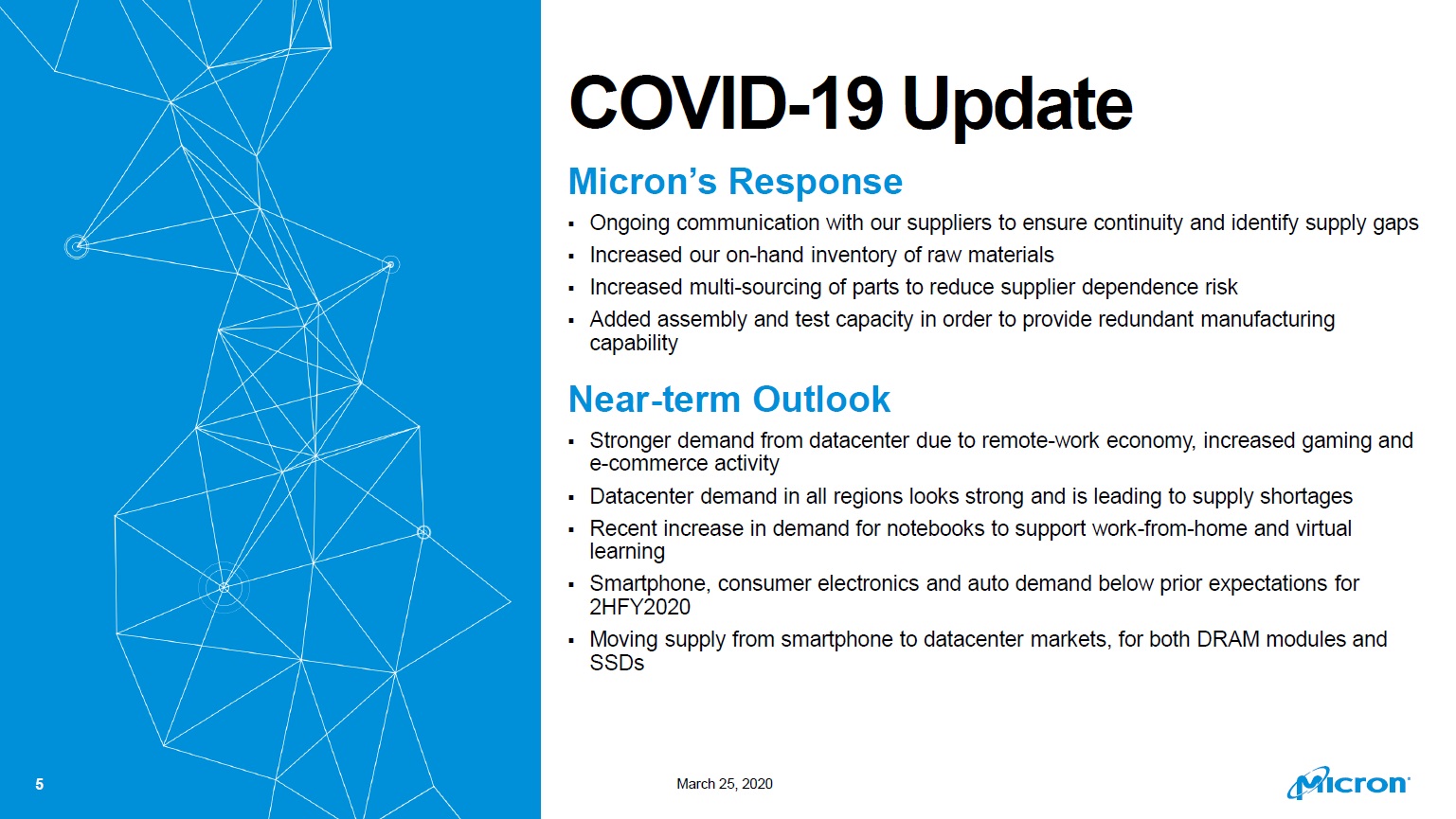 マイクロンテクノロジー(MU)は半導体メモリーのメーカーである。DRAMとNANDと両方を作っている。そのマイクロンテクノロジーがこの新型コロナウイルスによる世界経済スローダウン予想の議論が喧しいこの時期に示した半導体メモリー業界の見通しが下記の通りだ。