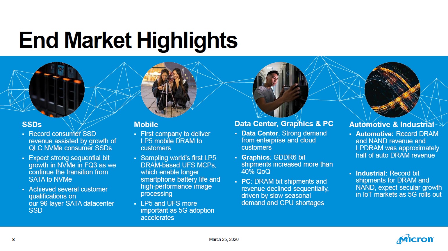 マイクロンテクノロジーが用意した最終市場別のハイライト説明はこちらのスライド。SSDで世代交代があるように、実はDRAMでも世代交代が行われる。これらを加速させるひとつの要因が5Gだ。