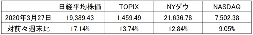 金曜日こそ下落したとはいえ、NYダウは先週+2,462.80ドルも上昇し、日本市場も日経平均株価で+2,836.60円の上昇となった。下の表で騰落率を見ると、日経平均株価の上昇率が群を抜いている。値動きは当然荒いが、下値を切り上げているのは事実。