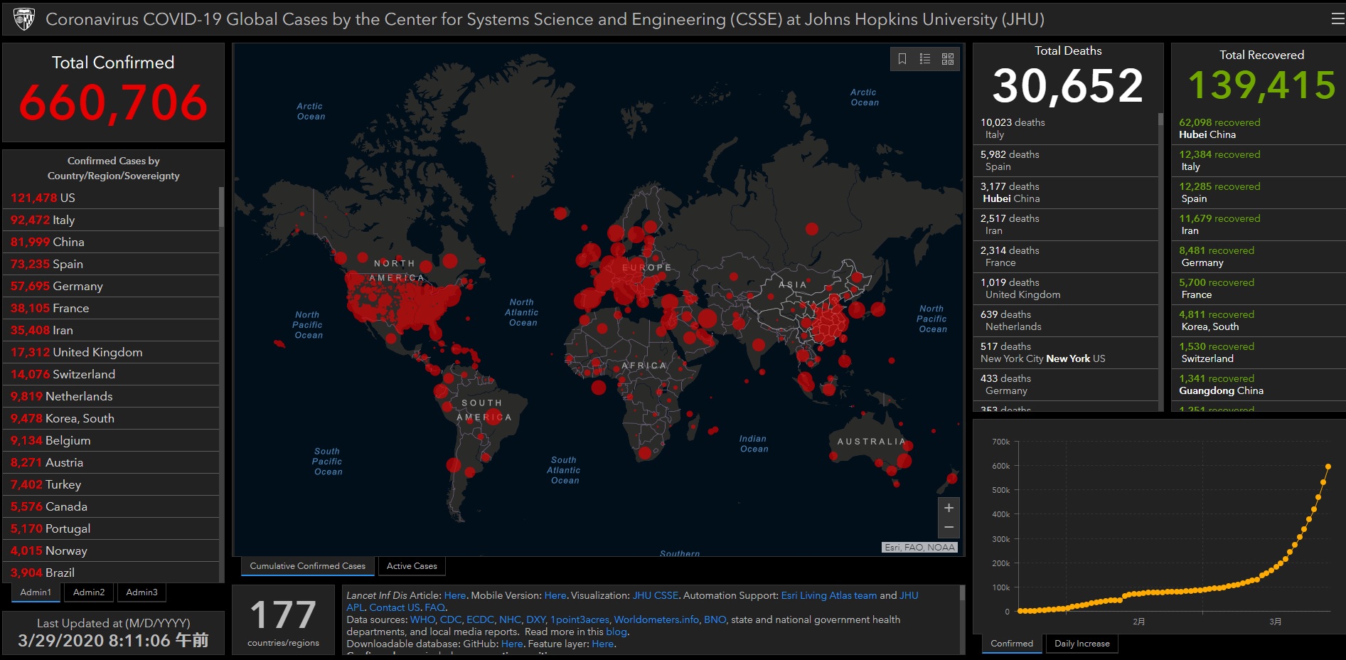 最後に参考までに3月29日朝現在のジョンズホプキンス大学の公表のデータから作成した表をお見せする。私の言わんとしていることがお分かり頂けるだろうと思う。死亡者割合でソーティングしてある。
