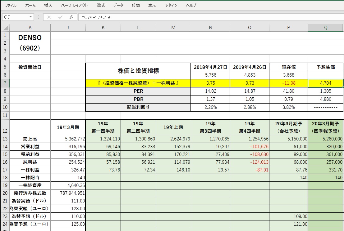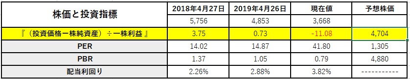 そして予想株価の欄には、この場合「2019年4月26日の水準」で計算すると幾らになるかという事が示されている。つまり昨年の決算発表時点だ。仮に今期の一株当たり利益が87円程度であろうとも、一株当たりの純資産を考えると4,704円とう水準は買われ過ぎとは言わないだろうということを意味している。そもそも、このモデルは、株価のフロアーを考える為に作って長年愛用している。
