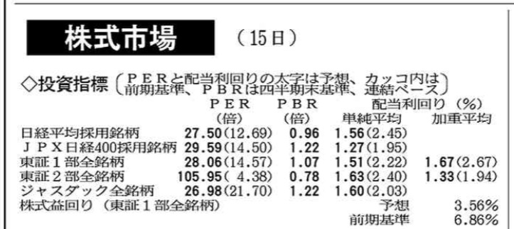 土曜日の日経新聞朝刊の「マーケット総合1」にこんな数字が発表されている。最上段の日経平均採用銘柄(225銘柄)の予想PERは27.50倍、前期基準ならば12.69倍と2倍以上も急激に跳ね上がっている。数値を8日の朝刊で確認すれば予想PERは16.84倍にまで急低下する。8日の日経平均株価は20,179.09円と15日の方が140円は安いことを踏まえると、更に15日のPERの方が高いことになる。にもかかわらずPBRは両日共に0.96倍だ。