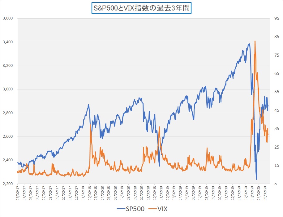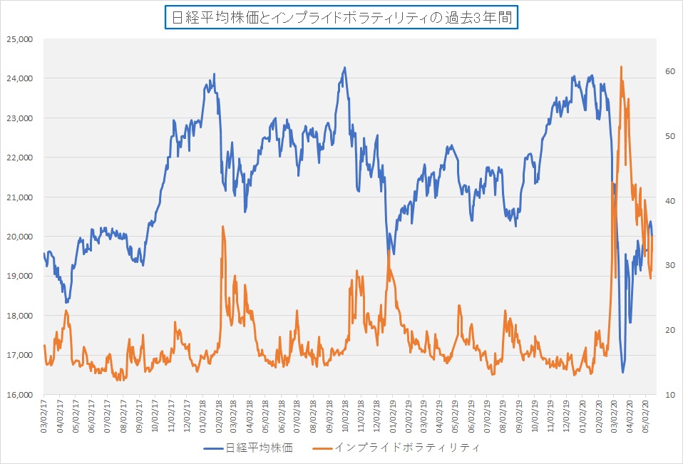 米国株と同じに、日経平均株価とそのインプライドボラティリティ(恐怖指数と同じ発想)の推移を見て頂きたい。米国株のように株価が右肩上がりにはなっていないが、明確に負の相関関係は認められ、週末時点のボラティリティの終値は32.13と過去2回の高値を下回ってきた。通常ならば、テンポは落ちるかも知れないが、やはりボラティリティの更なる低下と、株価の上昇がこの先には観測出来る筈。2番底等を考える必要は無さそうだ。