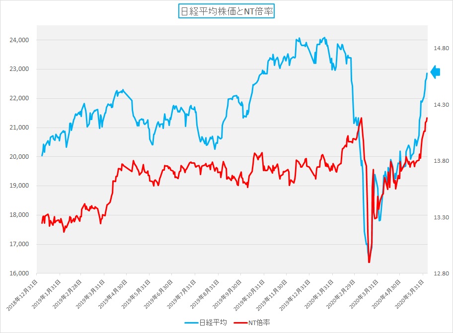 このところ上げっぷりが良い日経平均株価だが、急激にNT倍率が上がってきているのが見てお分かり頂けよう。週末の日経平均株価の終値は22,863.73円だが、NT倍率は14.18にまで上昇している。仮にこれをNT倍率13.6としてTOPIXから弾き返すと21,929.73円となる。つまり1,000円程度はTOPIXの水準が変わらずとも日経平均株価は調整し得るということだ。