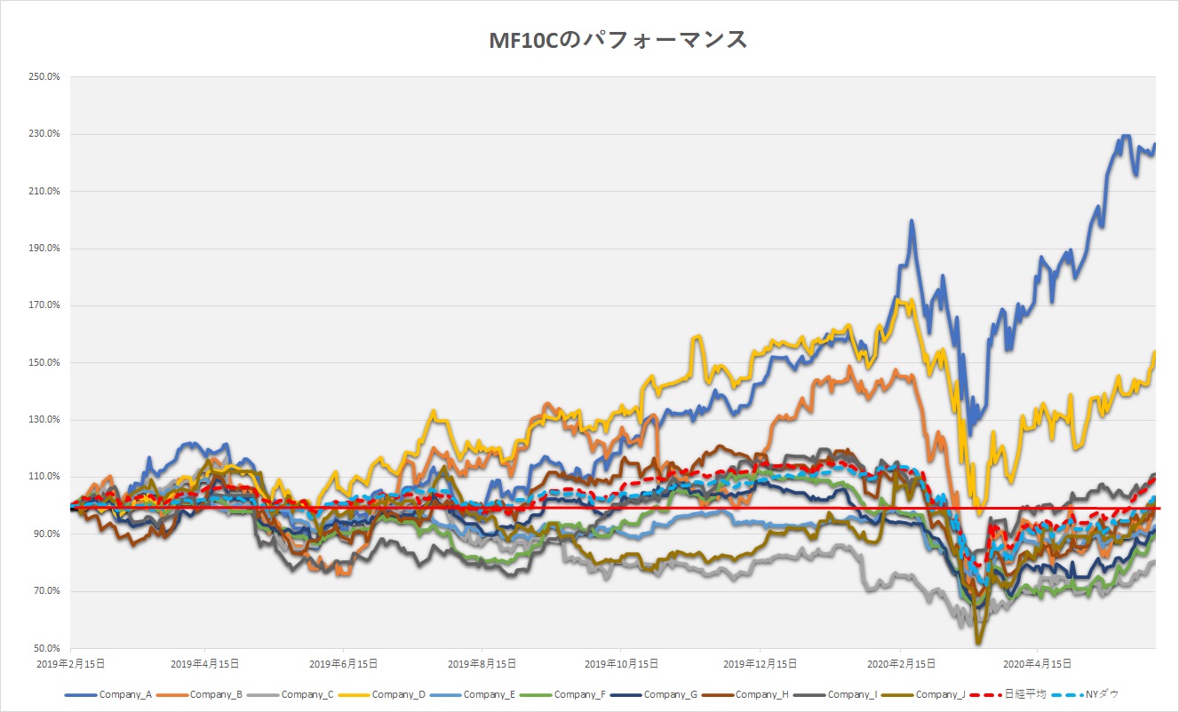 久し振りに下記のチャートを見て頂こう。これは現状のMFCLがまだMF10C(My Favorite 10 Companies)と呼ばれていた時のもので、その企画をスタートした2019年2月15日を起点に各銘柄がその後にどういう軌跡を辿ったかを示したものだ。このチャートには配当は含まれず、純粋に価格変動だけをみている。MFCLにアップグレードしてから、銘柄変更時などに内容が複雑になって寧ろ誤解を招きかねないということもあって毎回の掲載は廃止としたが、データ自体は毎日更新している。
