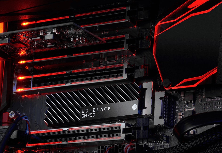 下記にご参考として、パソコン用の最新のWDCのSSDがPC上にどのように搭載されているかをご覧に入れよう。さて、下記の写真の中でどこにあるのがSSDだろうか?そう真ん中よりちょっと下にあるヒートシンクがついた「WD_BLACK SN750」と書いてあるのがそれだ。容量は250GBから2TBまで現状選択可能。特徴はヒートシンクが発熱対策としてついているということ。以前のように、パソコンケースの中の「ドライブベイ」と呼ばれるところに鎮座しているのではなく、マザーボードに直挿しとなる。すべて速度を落とさない為だ。