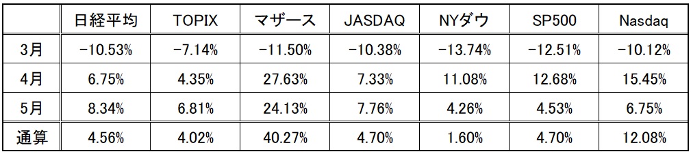 下記に日米株価指数の3月から5月までの各月と通算の騰落率をまとめてみた。ご覧頂けるように、3月の下落率に凸凹は多少あるものの、そう大きな違いは無い。だが、4月から5月の上昇率はマザースが群を抜いている。