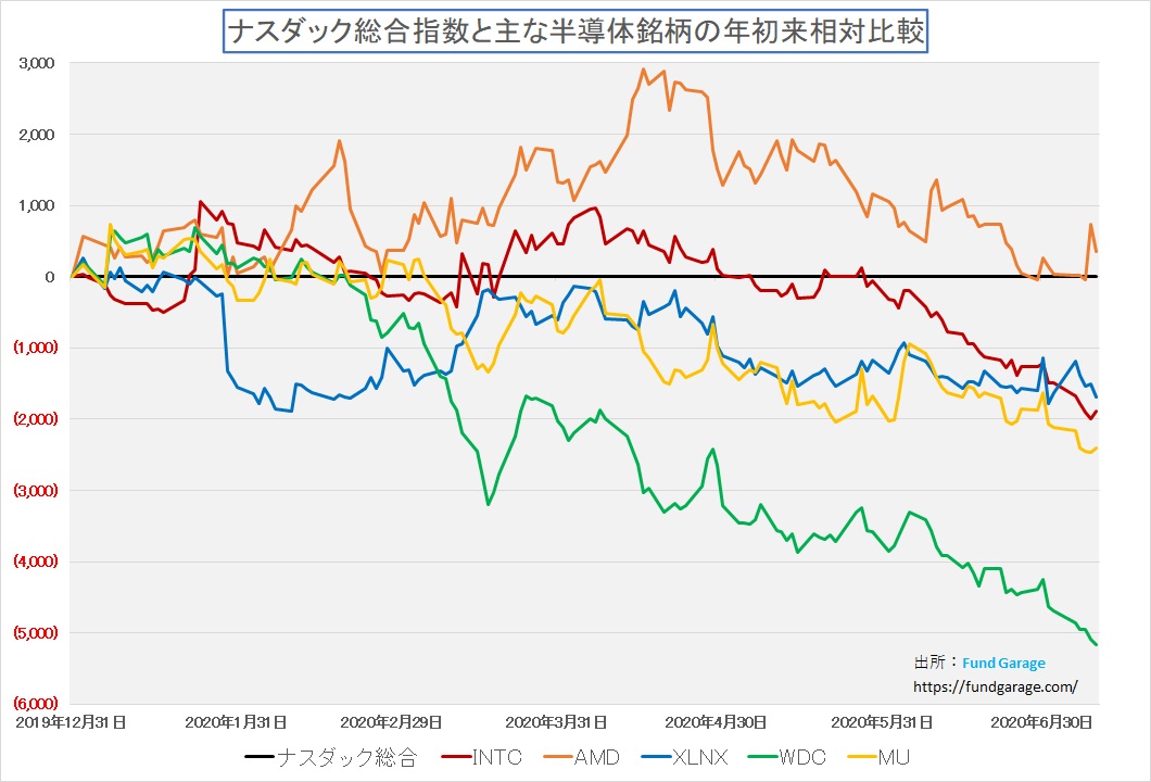 逆にその右側の5銘柄を見て頂こう。これが前回もお伝えした主要な半導体株だ。インテルは今週で年初来がマイナスになったが、AMDを除き、構成指数が+18.33%も上昇している中で、ハイテクの要である半導体株の状況は冴えない。ウェスタンデジタル(WDC)などは、NASDAQに比べると50%以上もアンダーパフォームとなっている。