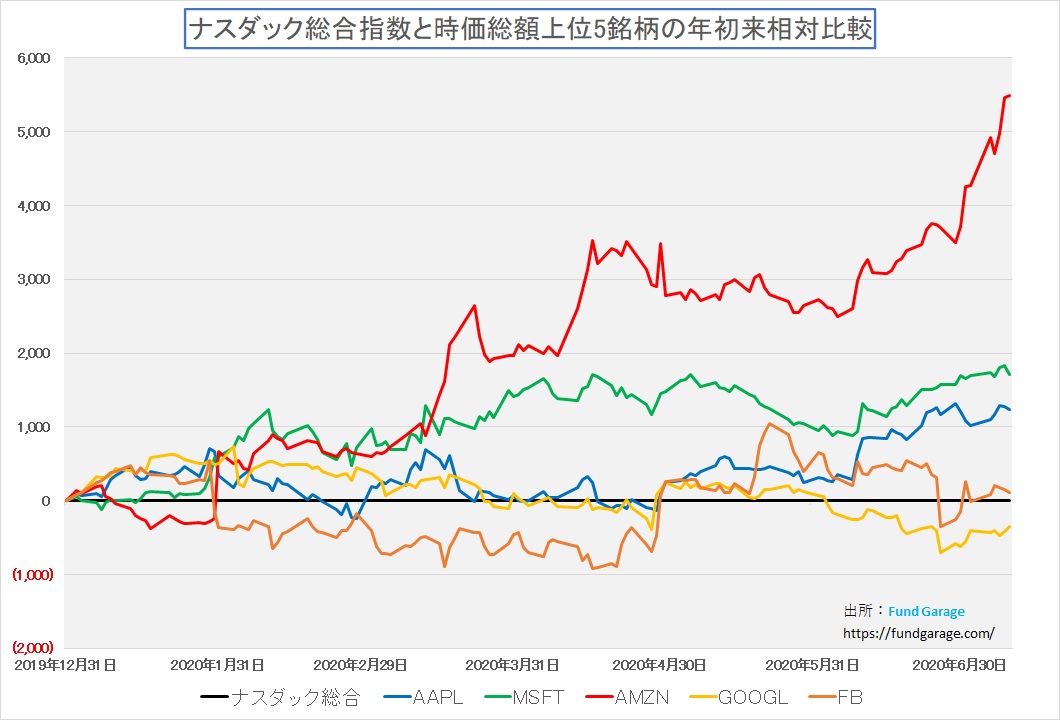 ならば、これらの上位5銘柄の年初来のパフォーマンスをNASDAQと比較してみたのが下記のチャートだ。前回と同じく、NASDAQとパフォーマンスを相対比較している。